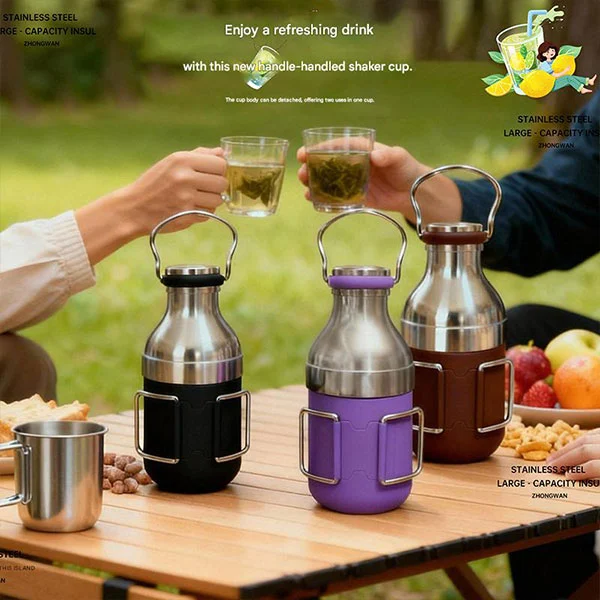 Botol berinsulasi luar ruangan yang dapat dilepas dilengkapi dengan pegangan agar mudah dibawa.