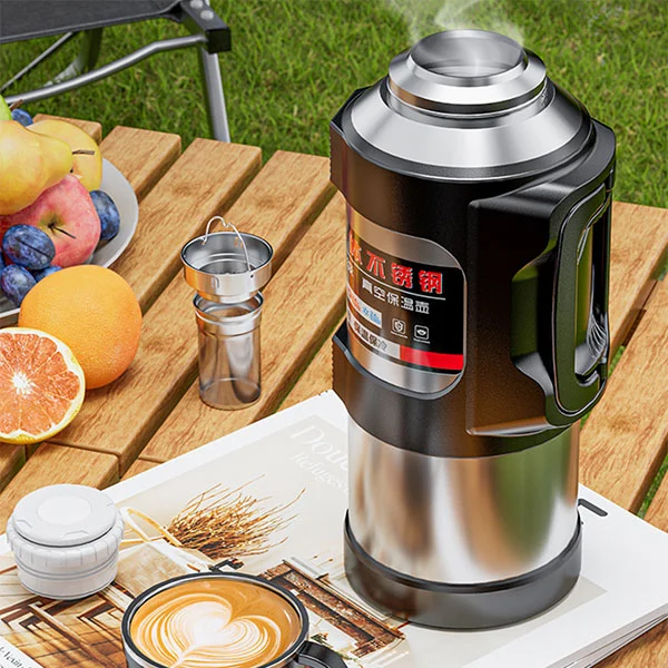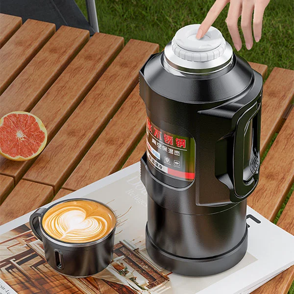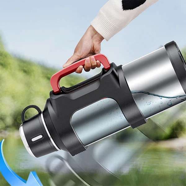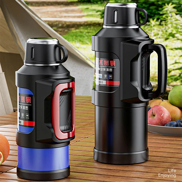 Ini adalah labu termos berkapasitas besar dengan kapasitas maksimum 6 liter. Satu ember air setara dengan 12 botol air mineral biasa, yang cukup untuk memenuhi asupan air satu orang selama tiga hari selama perjalanan.